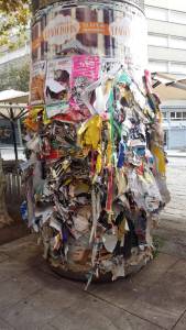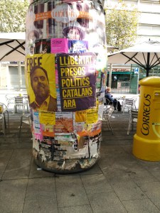Y es que alguien había enganchado carteles independentistas y otros los arrancaron en el pirulí de al lado. Metáfora de la división de la sociedad catalana. Corazón roto y desbordado por el dolor de una causa compleja, desbordada y desbordante.